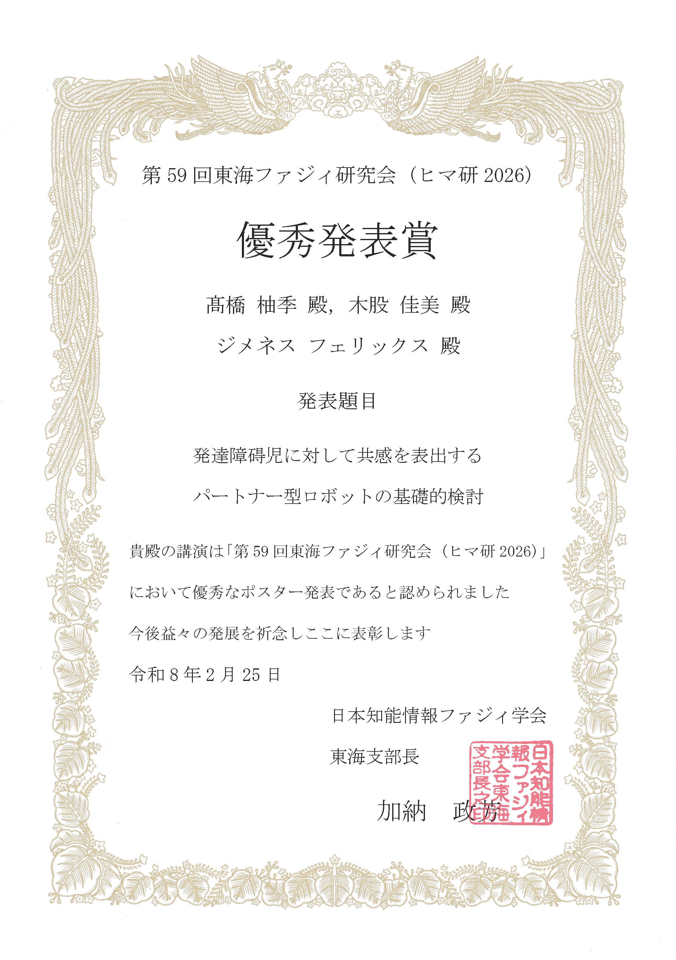 情報科学部学生が、第59回東海ファジィ研究会にて 「優秀発表賞」を受賞しました! 2026.02.26AWARD, News 該当論文 発表者:髙橋柚季 著者名:髙橋柚季, 木股佳美,ジメネスフェリックス 論文題目:発達障碍児に対して共感を表出するパートナー型ロボットの基礎的検討 AWARD, News 小栗宏次教授・村上和人教授 最終講義のご案内 関連記事一覧 カメリアドラゴンズのメンバーがロボカップ研究賞を受賞しま... 情報科学研究科の学生が、第22回情報学ワークショップ(W... 第25回計測自動制御学会システムインテグレーション部門講... 情報科学研究科の学生と情報科学部の学生が、第40回ファジ... 大学院情報科学研究科の学生が、研究発表した学会から表彰を... 情報科学研究科の学生が2025年度電気・電子・情報関係学... カメリアドラゴンズが人狼知能コンテストの2025年度春季... 大学院情報科学研究科の学生が電気学会主催の電子・情報・シ... 情報科学研究科の学生がMetameクリエイティブコンテス...