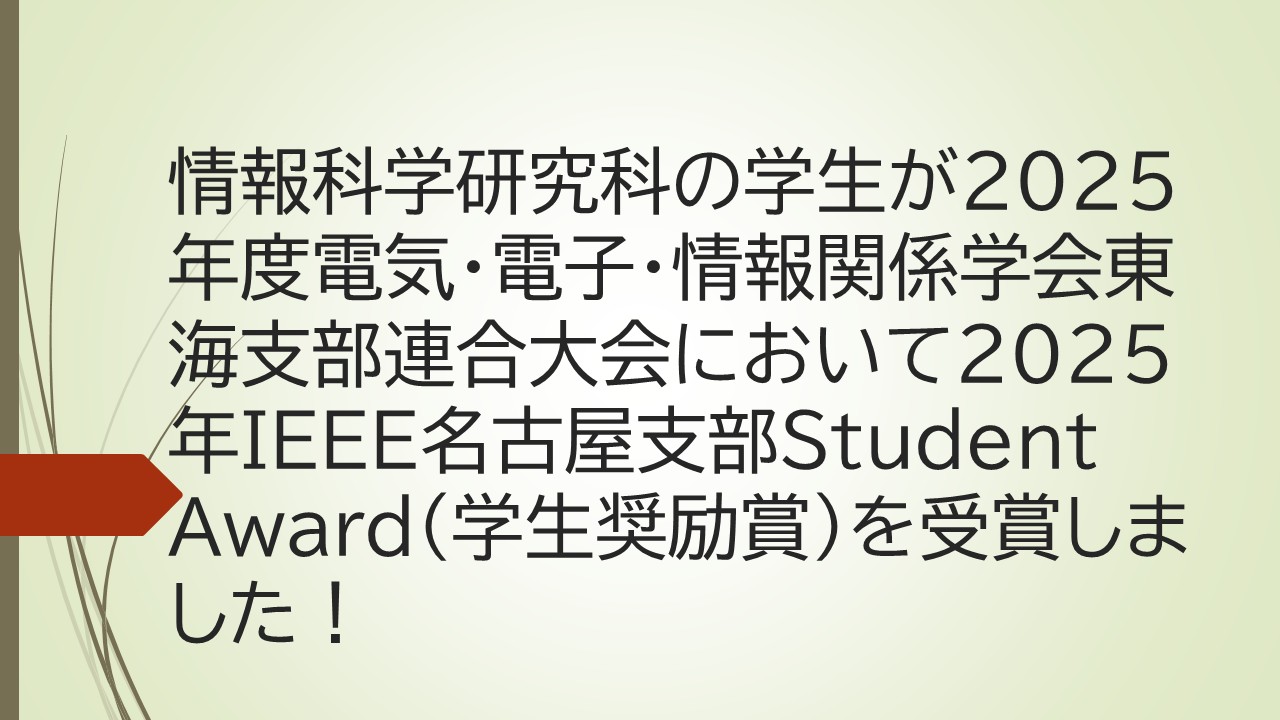 情報科学研究科の学生が2025年度電気・電子・情報関係学会東... 2025年度電気・電子・情報関係学会東海支部連合大会における発表者の中から、下記2名の学生が2025年IEEE 名古屋支部学生奨励... 2026.02.02AWARD, News
